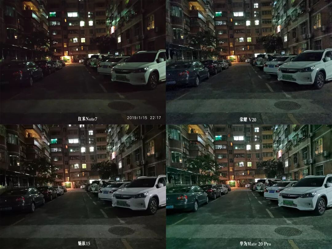 夜景方面,4台机器亮度差不多,整体观感都很不错,红米Note 7的表现接近魅族15,高光压制稍差,解析力比不上华为兄弟。
