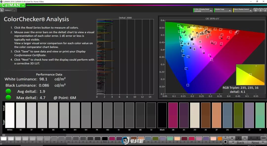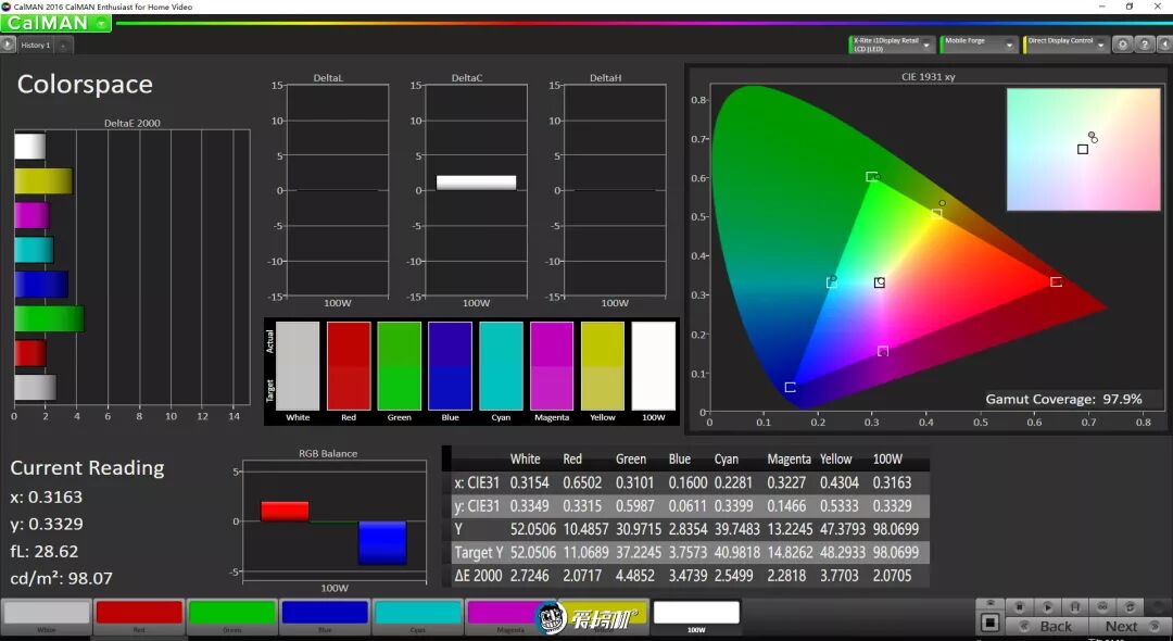 标准模式下,色温接近6500K,色域覆盖97.9%sRGB,平均色彩偏离1.9,最大色彩偏离4.7。