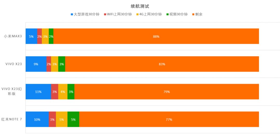 在2小时高强度测试之后(30分钟游戏、30分钟WiFi上网、30分钟4G上网、30分钟视频),红米Note 7的剩余电量为77%,在这几台手机中是最少的。