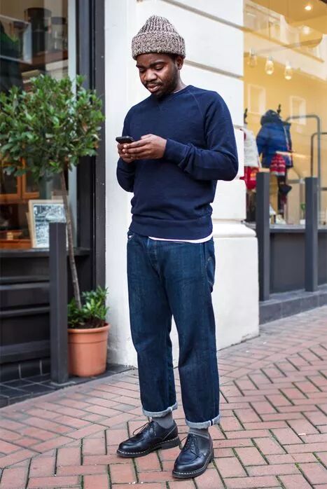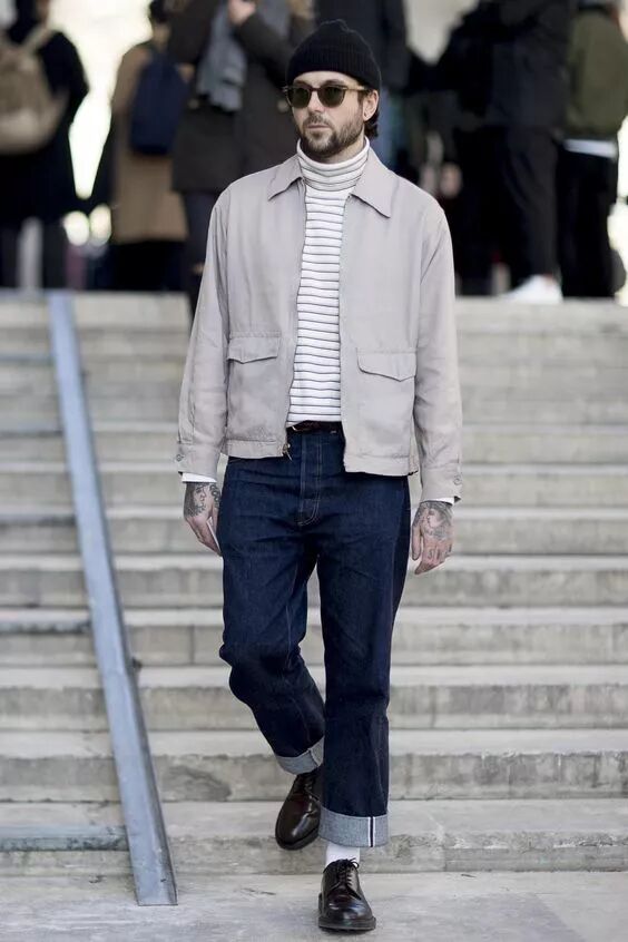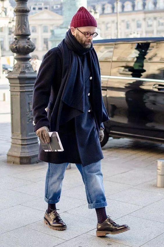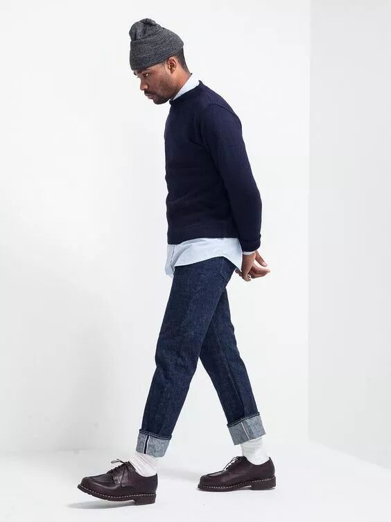 卷边牛仔裤+高筒袜及皮鞋能不仅保证了温度,还能在寒冷的冬天露出脚踝!