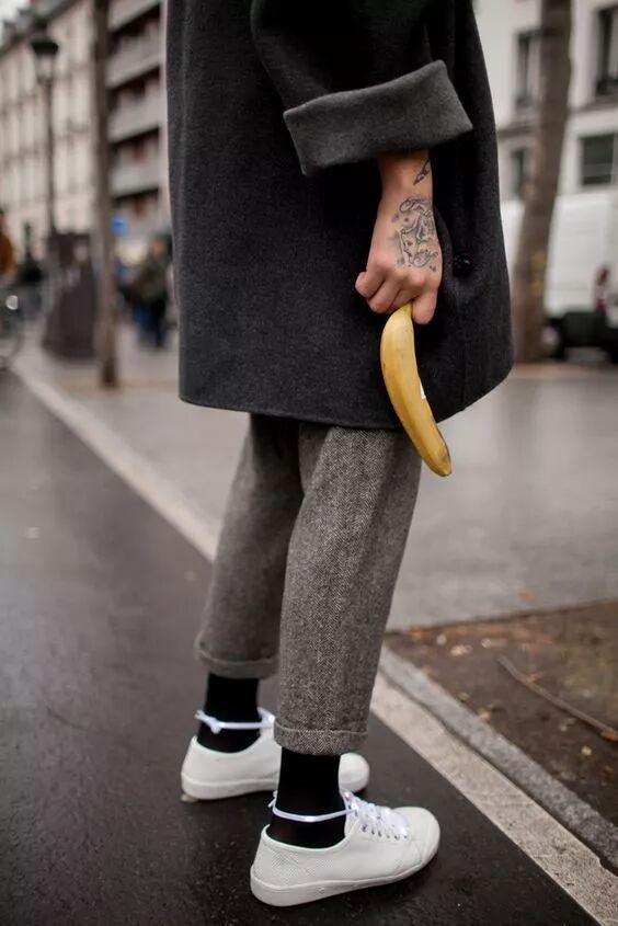 高筒袜加上板鞋或是球鞋,轻松营造出休闲正装风!
