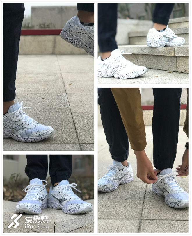 笔者拿到手的鞋颜色是白/黑,主打白色配上黑色泼墨以及亮银色logo。上市时间在2018秋季,属新款WAVE ZEST。吊牌价798元。单次3-10km中短距离跑步适用。