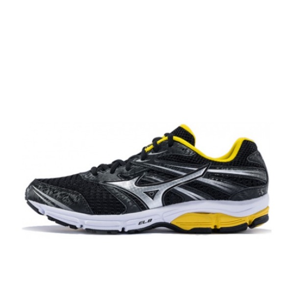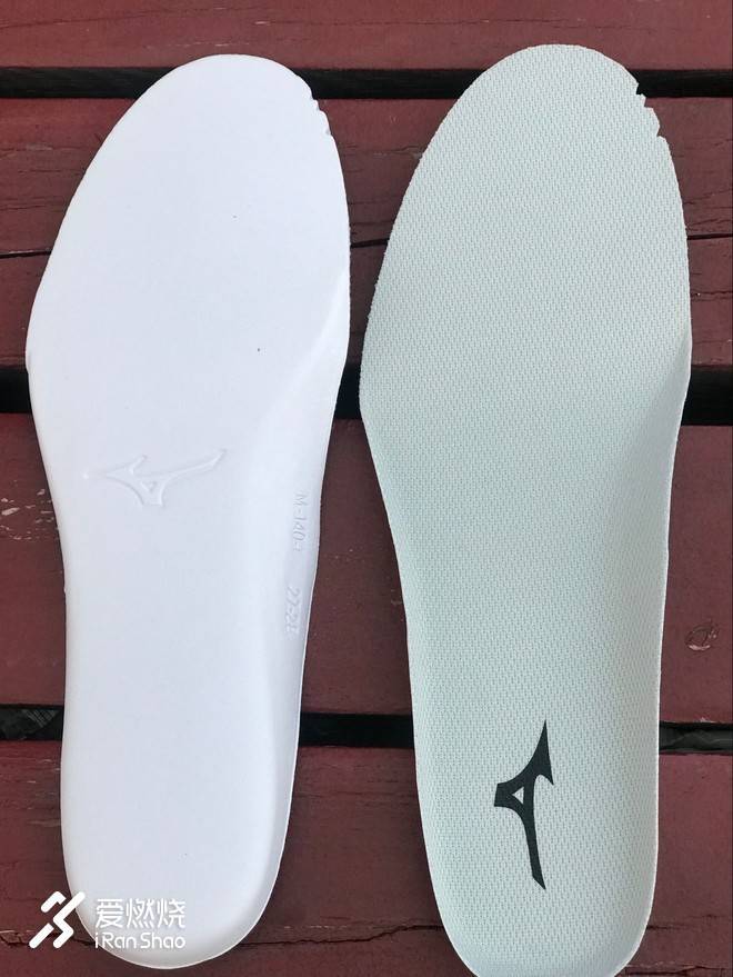 然后来到鞋舌,外侧缝制鞋带孔,内侧有生产地、鞋码、款号等信息。普通运动鞋带搭配黑白logo的鞋带孔,看上去样子一般很低调。鞋尾的话除了印花泼墨,就是美津浓的logo了。鞋垫是纯白色加黑色标志,泡沫与网布压制的两层式设计。在我见过的众多跑鞋中,这是比较低端的鞋垫设计了。对一双跑鞋来说,直接接触脚掌的也就是鞋垫了,尤其长距离跑步对鞋垫的要求比较高。个人感觉鞋垫这里应该升级,否则跟那些普通的跑鞋没什么区别。在这里我也放一张鞋垫的特写好了。