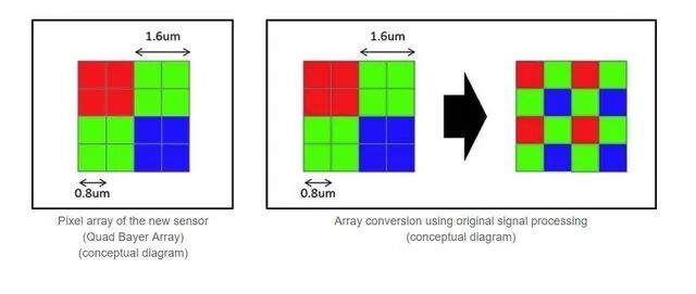 反观索尼的 IMX 586,不但使用 Quad Bayer 阵列将阵列扩大为 4 × 4,而且 2 × 2 的排列方式为四格分散 RGB 相邻排列。因此,索尼 IMX 586 更像是传统定义的拜耳 4800 万像素感光元件。除了使用 Quad Bayer 阵列以外,索尼 IMX 586 每一个像素都能单独控制曝光时间,并同步输出相片,此举能大幅提升成像动态范围,单张成像即可媲美当下惯用的多帧合成 HDR 算法,从而降低 ISP 和手机的负担。