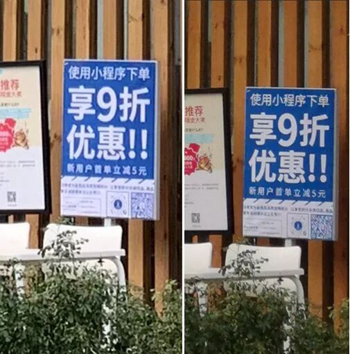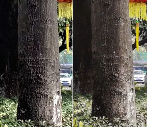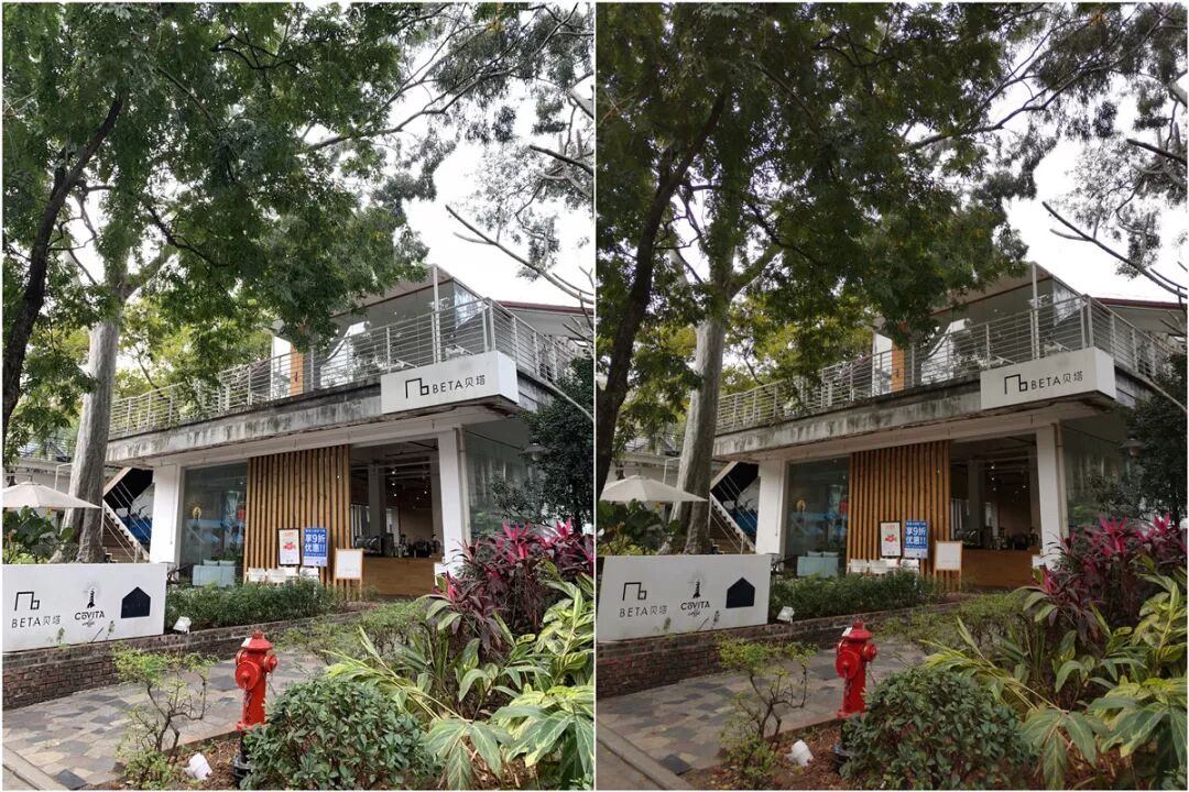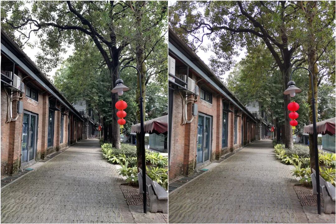 ▲iPhone XS Max(左)/ 荣耀 V20(右)样张下面这组样张能看到更明显的区别,右边样张上的招牌文字、楼顶上的树叶都能清晰可见,反之左边的文字部分已经有点模糊了。▲ iPhone XS Max(左)/ 荣耀 V20(右)样张