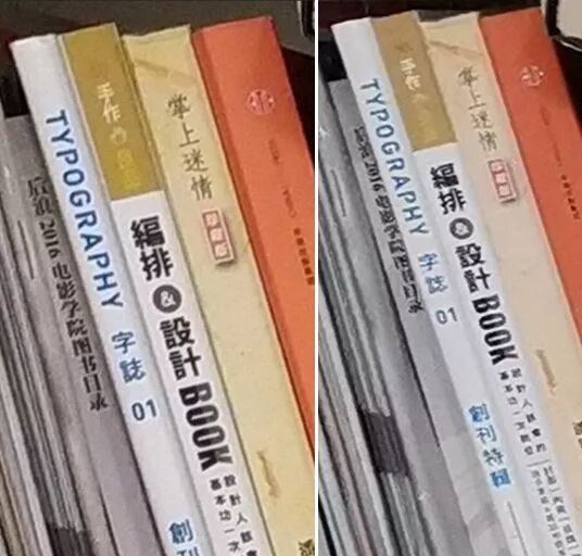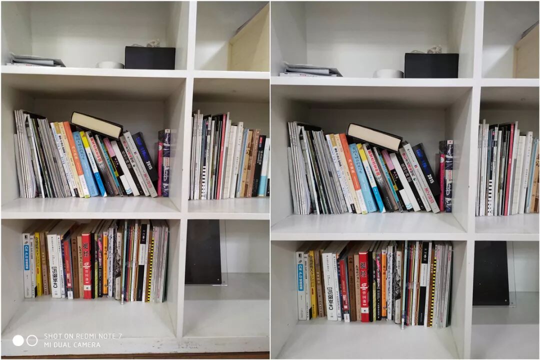 ▲ 红米 Note 7(左)/ 荣耀 V20(右)样张第二组样张我选在了光线较暗的室内环境里,局部放大到书架里的书名,IMX 586 在暗部解析力方面的表现对比 GM1 并没有户外那么明显。细节观感上,GM1 的表现要更圆滑一些。
