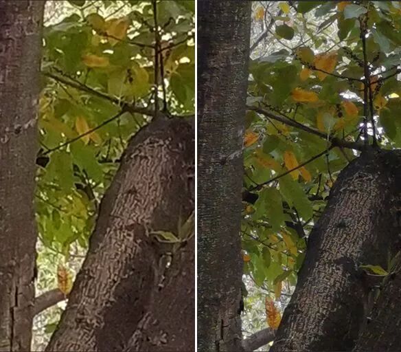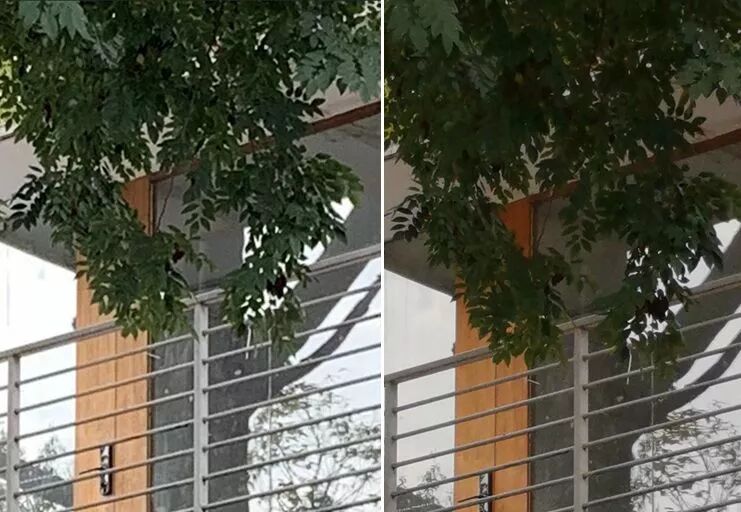 通过实际对比能更直观地看到 1200 万和 4800 万像素的区别。在下面几组对比中,左图是 1200 万像素的 iPhone XS Max,右图是荣耀 V20,看小图好像区别不大,但当我们将样张均放大 100%,就能看到不同像素在细节上的区别。