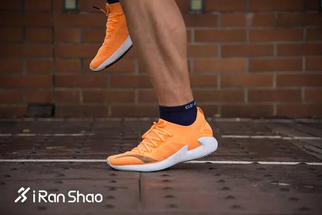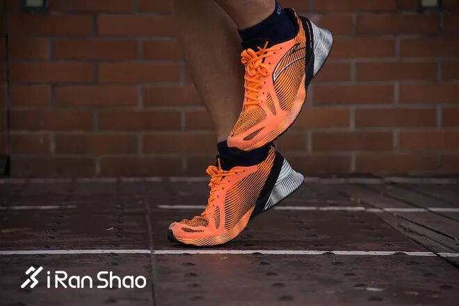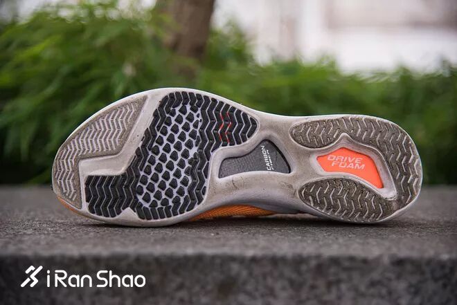 追风的鞋面为弹性面料,没有支撑只有包裹。中底两侧有鞋床一样的支撑设计,并有增加稳定的碳板,缓冲性能出色。