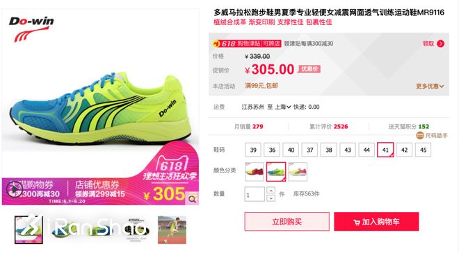 目前在天猫官方店多威MR9116的到手价格是275元(如下图售价,满300减30),这也和MR9116的鞋面用料与中底用料成本较低有关。