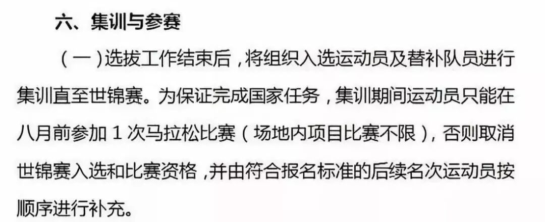 在中国田协颁布的《2019年世界田径锦标赛马拉松运动员选拔办法》里有关「集训与参赛」的有一条规定: