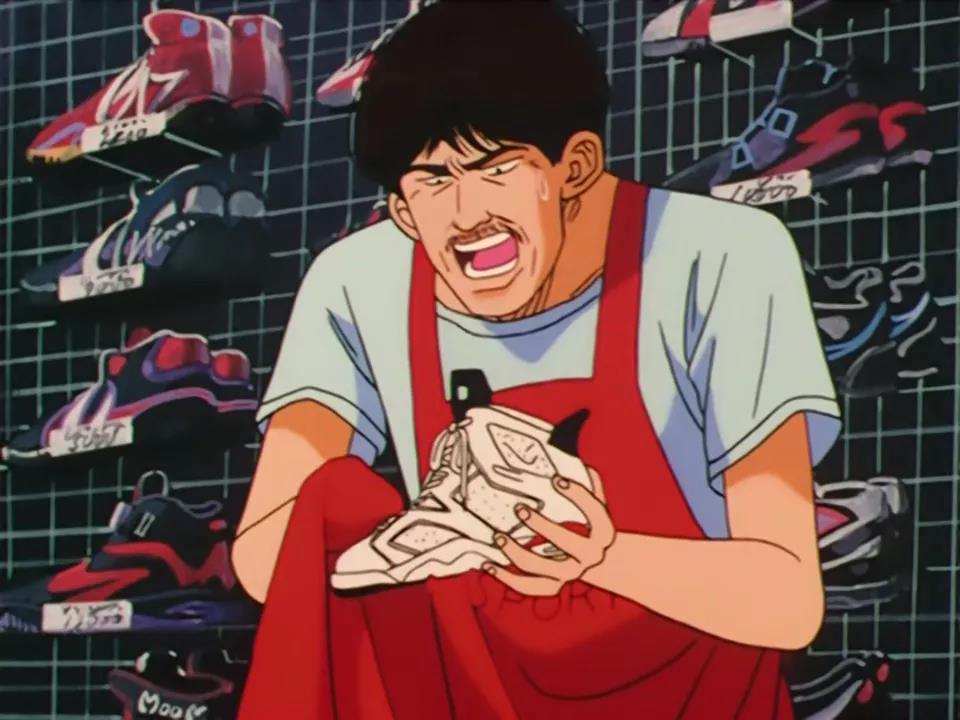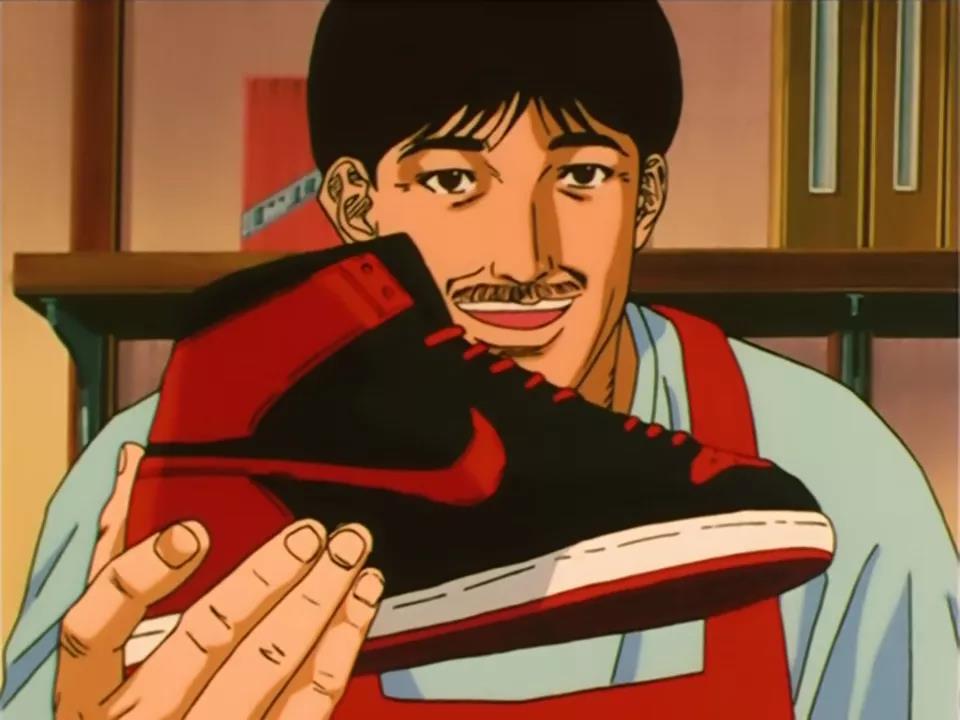 《灌篮高手》至今能保持着超高的人气,球鞋在其中所扮演的角色是举足轻重的,笔者的球鞋启蒙也正是樱木用30日元买到的那双Air Jordan 6。在当时那个年代,小胡子老板那样的Sneakerhead绝对是少数,当时大多人的观念都和樱木一样,球鞋就是一个道具而已(也是因为没钱)。而第二次,手持黑红Air Jordan 1说出的那句「这是湘北的颜色」让无数人记忆犹新。关注球鞋的他不可能不知道公牛队的存在,而湘北更像是他对于球鞋情感的寄托。