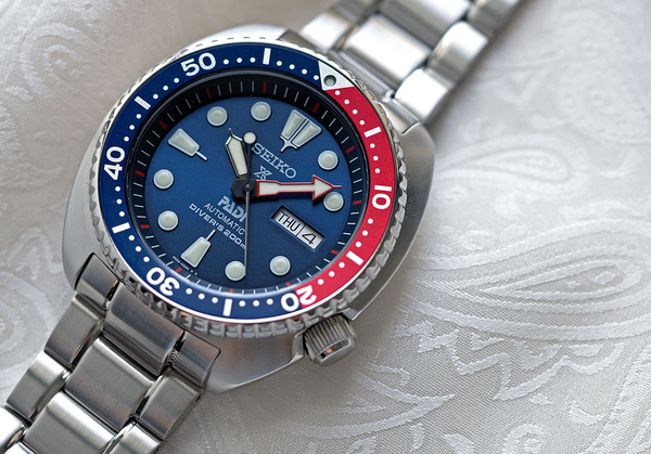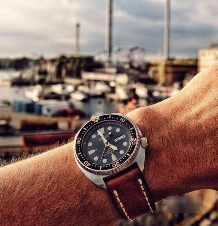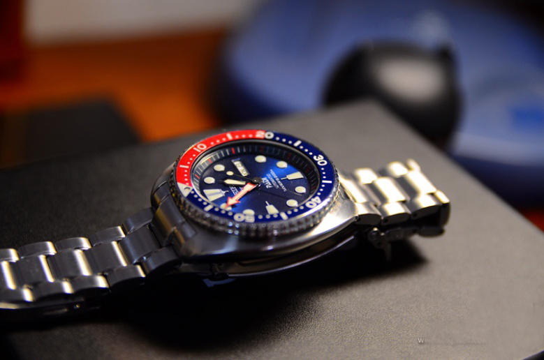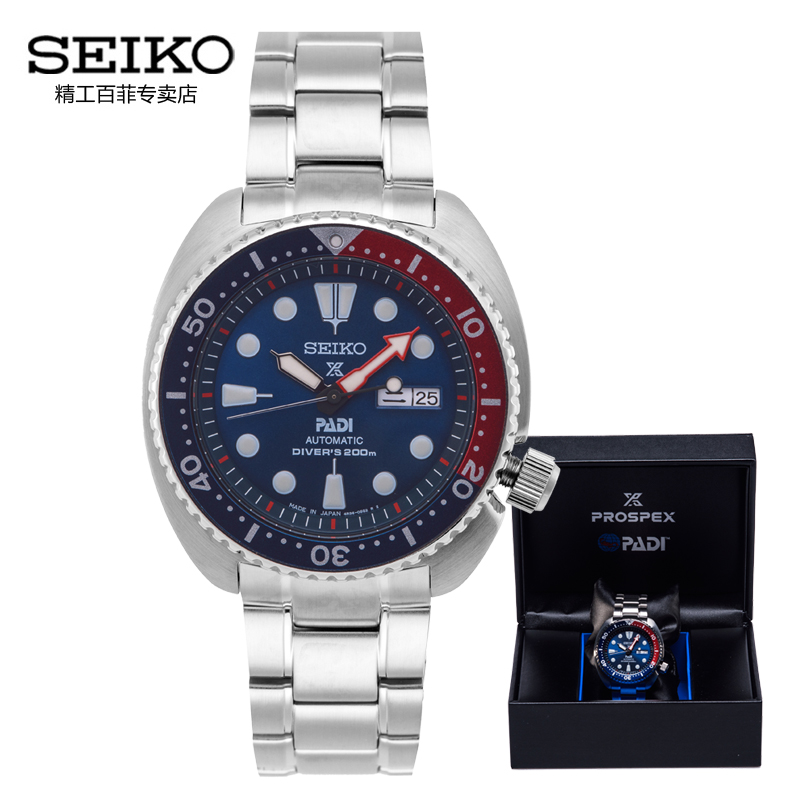 精工与全球最大的潜水教练协会PADI推出联名合作款潜水表,复刻80年代大受追捧的鲍鱼壳潜水表(turtle 6309)最好看的一款,其特点就是形如龟壳般的壳形(国内表迷一般称之为鲍鱼壳)。红蓝配色像是可乐一般也要比老款看上去更亮眼吸睛。蓝色放射纹表盘配上分布在刻度/指针和表圈上的正红色调,丰富的色泽和浓厚的运动风格非常适合夏天呢。表径44-45mm,4R36机芯,200M防水。缺点之一则是他仅能保持40小时左右的动力储备。