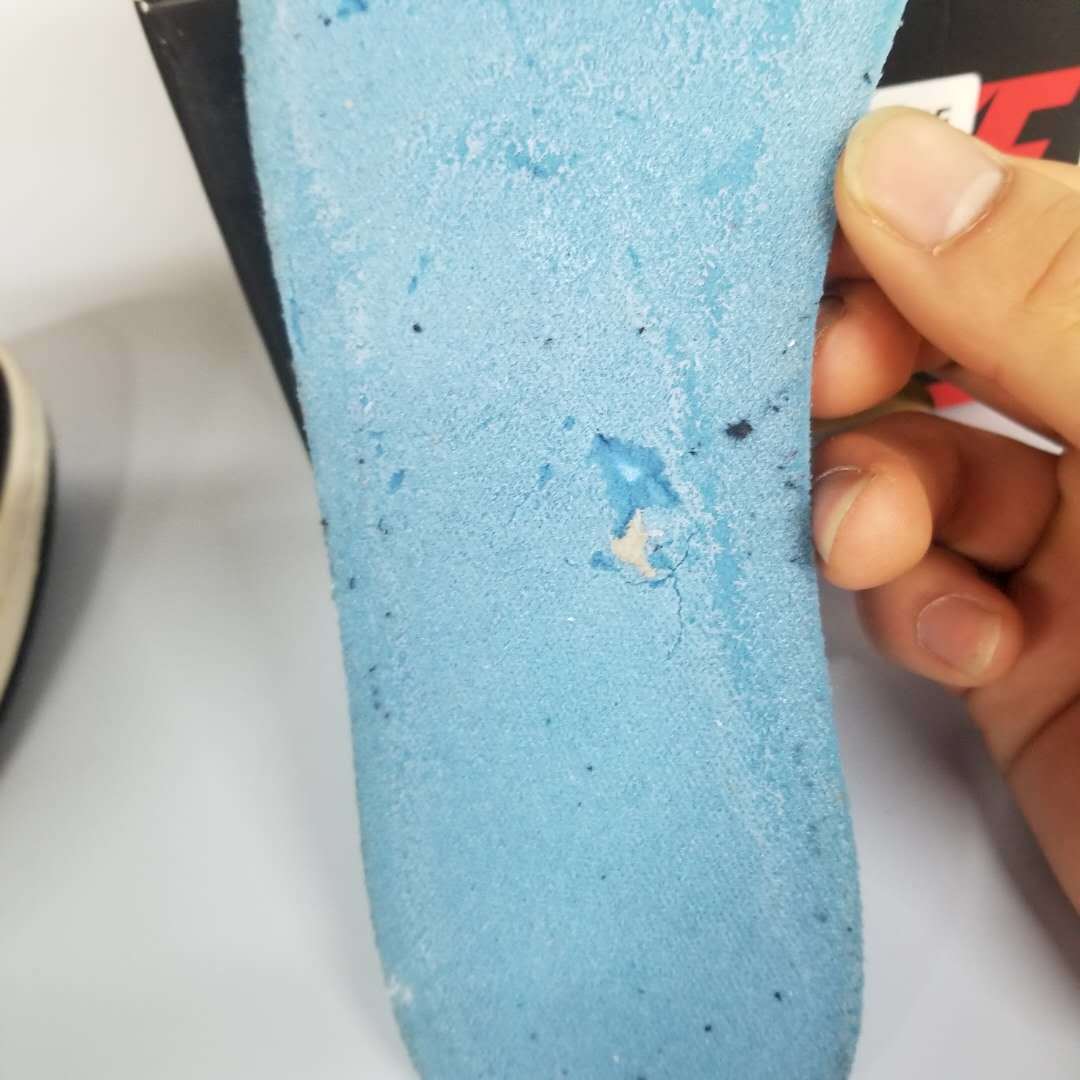瑕疵情况:右鞋鞋垫破损 左鞋中底走线线头断裂 左鞋鞋头做工瑕疵