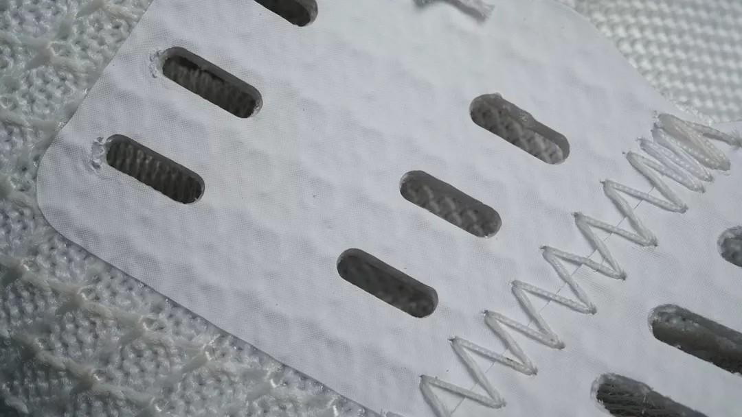 这上面有三排的鞋带穿孔然后这三排的鞋带穿孔呢,全部都是契合着在内部也做出了三排就相当于你可以直接从这边进行一个穿插。