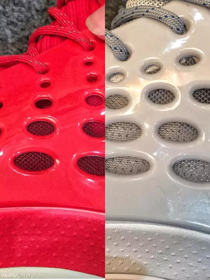 接下来说一下低帮和高帮之间的几个不同点,第一处就是如上图的侧面tpu那一块,用的材质形状包括里面的塑料网纱都一样,但低帮在塑料网纱里面还有一层内靴的内衬,而高帮由于是袜套设计,所以就只有一层塑料网纱