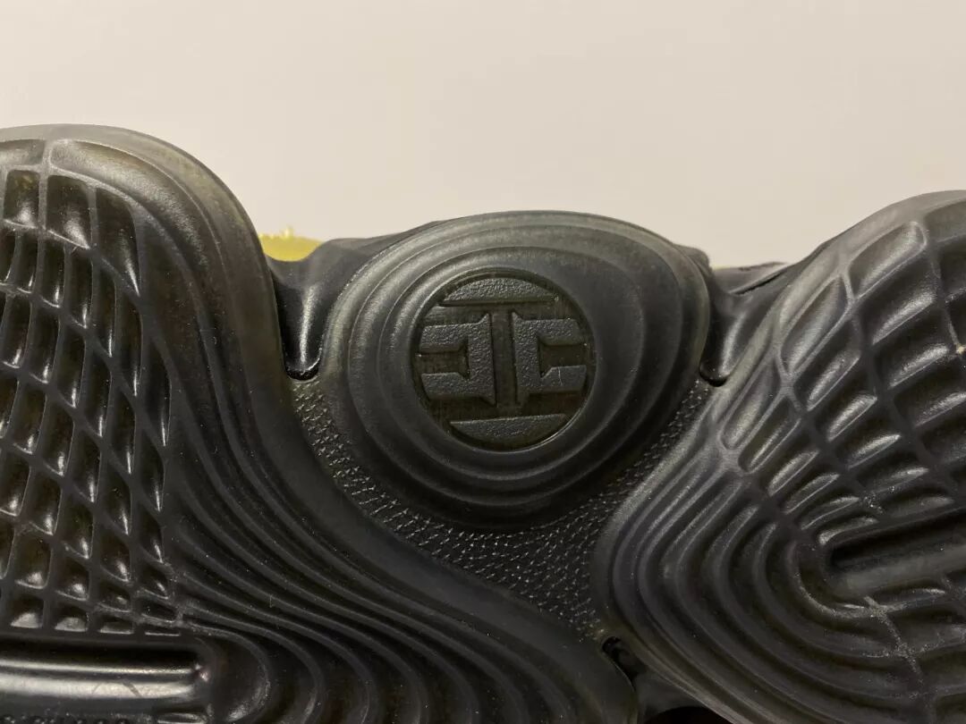 不过,这样的中底设计,与中底材料无关啊,我只是说这样的切割设计,简直是要了我的命。大家看一下鞋底有哈登logo的这个位置,这部分是不会接触到地面的,而且它刚好是鞋面上的这个加强筋所对应的位置。所以实战的时候,这部分会给你的足弓部分一个很大的作用力,特别是你在突破的时候,你的脚向内发力,那刚好是会顶到这个位置。对于我这种扁平足来说真的是疼到自闭。当天我们录制完素材在实战的时候,我打了5分钟就疼得不行下场换鞋了。