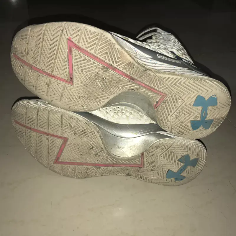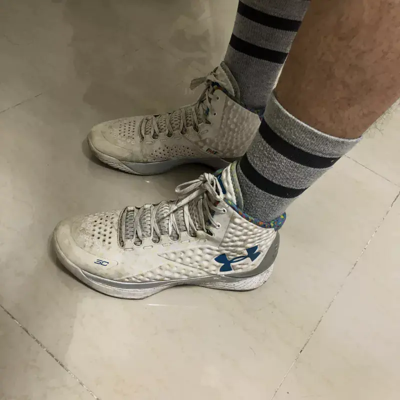 Curry 1采用了Charged中底缓震技术,试穿脚感没有很硬,但是反馈似乎略显不足。有看过以前拆解的应该知道,这其实是一种不同密度的缓震胶了,如果不是重型选手的话,应该还凑合够用,不至于震脚,启动不拖沓。鞋面采用的是一种网面和EVA搭配使用的Anafoam鞋面,这种鞋面还比较轻质,而且兼顾了一定的强度,不会觉得软绵绵,但是久了前掌内侧弯折处的折痕还挺明显。另外,鞋面还做了不少的透气孔去达到透气的效果,话说这透气孔还不小。重量上,单只43码约400g,在高帮鞋来讲应该还算轻质。前掌相对比较窄,包裹很紧致,而后掌脚踝处的填充比较缺失,鞋帮也比较高,得靠把鞋带系紧来尽可能达到鞋帮贴脚,强烈建议穿着一定高度和厚度的篮球袜,不然这个高帮还比较能磨脚。可能是为了方便Curry双脚佩戴上护踝吧,单纯鞋子后跟的包裹,包括TPU的包覆范围对我这种玻璃属性来讲是不太及格的。我在有一次全场实战中当场崴了3次,无对抗跑动自己崴的,踩到别人脚崴的,绊了别人脚崴的,都遇到了!好在我开场前就把鞋带系得贼紧(这可能是我的一个个人习惯吧,没有安全感的孩子),崴了后都靠系紧了的鞋帮给掰回来了。坚持打完后,没有很肿胀,但是接下来的两周痛感还比较明显。鞋子前掌的防侧翻设计是有,但其实并不强悍,包括贯穿整个鞋外侧和后跟的TPU,其实强度和包覆范围似乎并不太科学。鞋底足弓处有塑料板,应该说得益于此,长时间穿着也没有觉得足弓很酸痛。