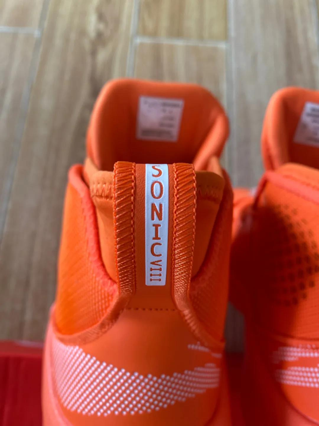 后跟鞋提的位置,左脚写的是“SONIC VIII”,也就是英文的音速8,后脚写的是中文的音速二字。