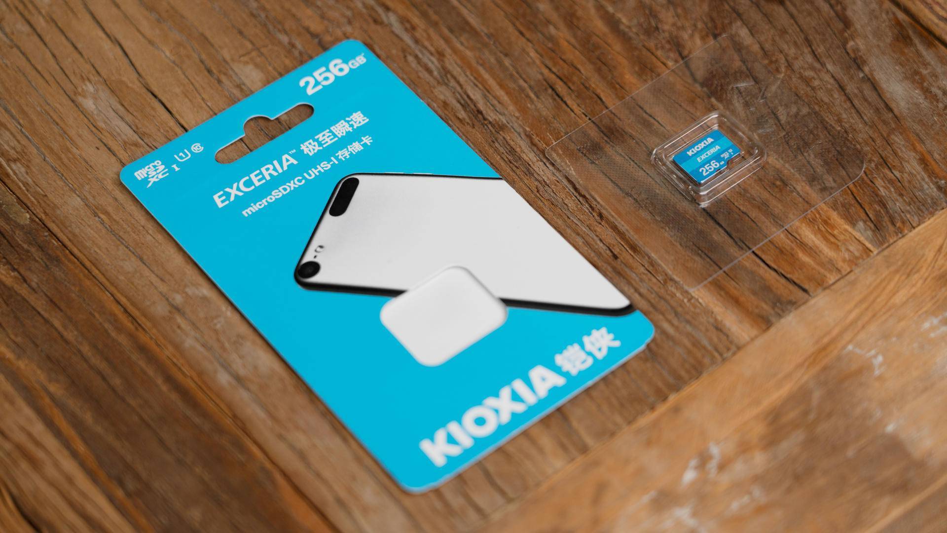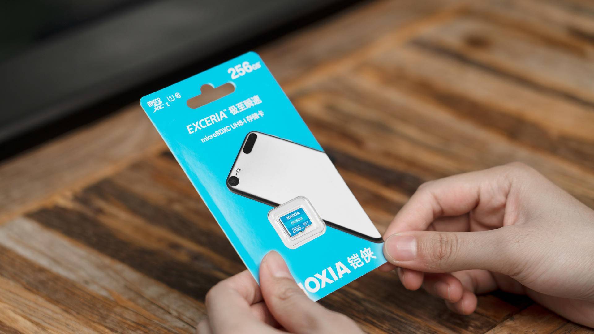 铠侠256GB EXCERIA MicroSD存储卡的包装为蓝色设计,表面标识有UHS速度等级、SD接口类型和速度等级,我们手里这张是256GB容量存储版本,透明部分可以直接看到MicroSD卡主体,下方“KIOXIA”的LOGO非常醒目。