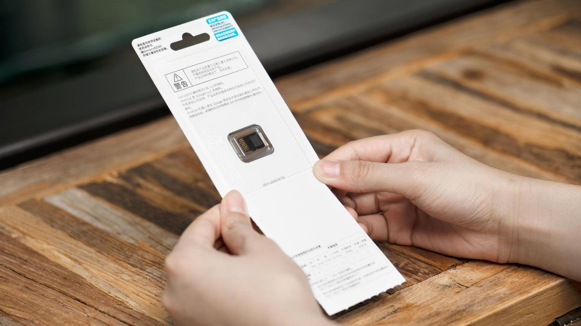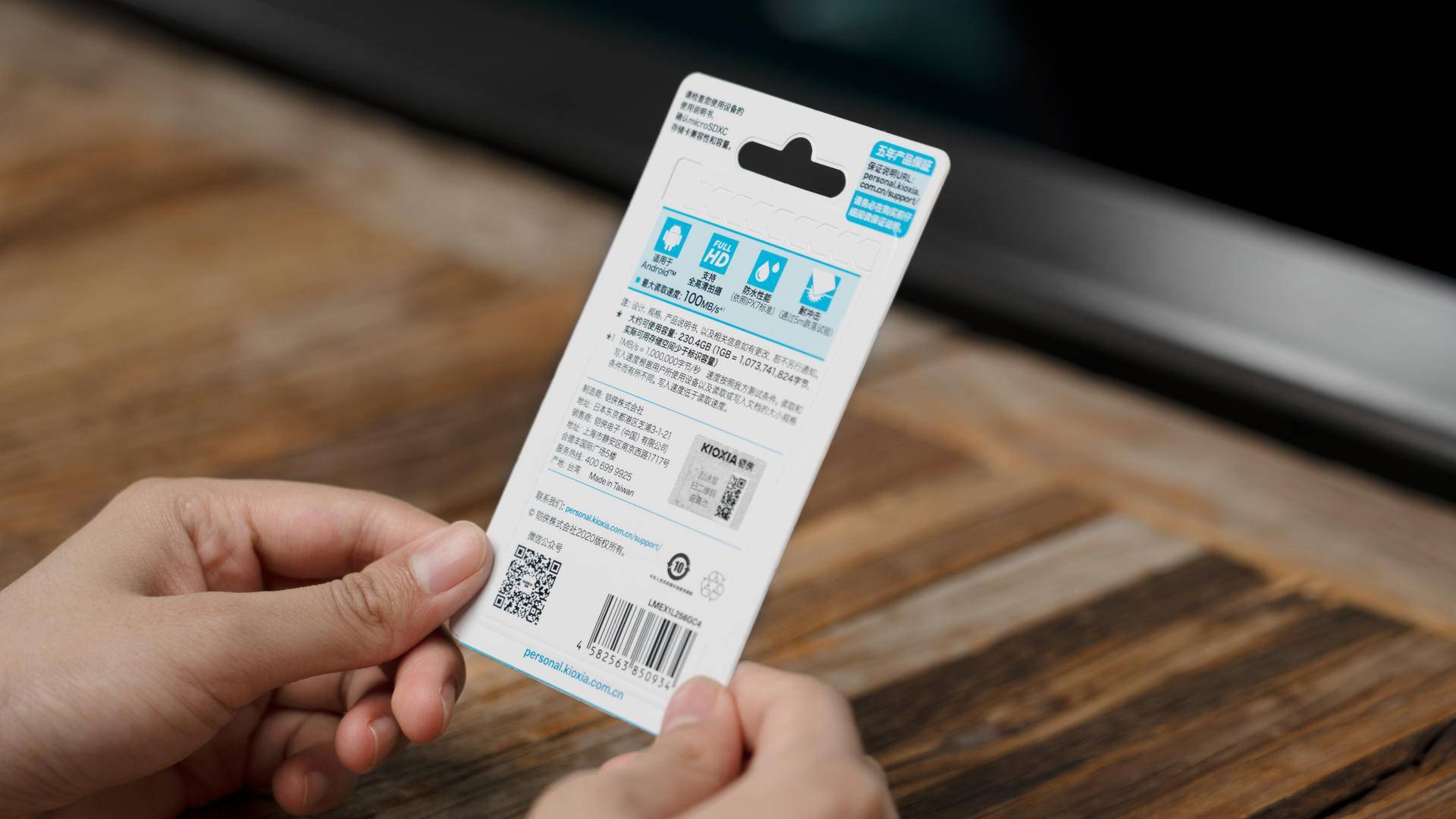 包装背面标注了更详细的技术信息,包括适用操作系统、Full HD拍摄标准、防水性能和耐冲击测试,通过易拉条即可轻松取出MicroSD卡。