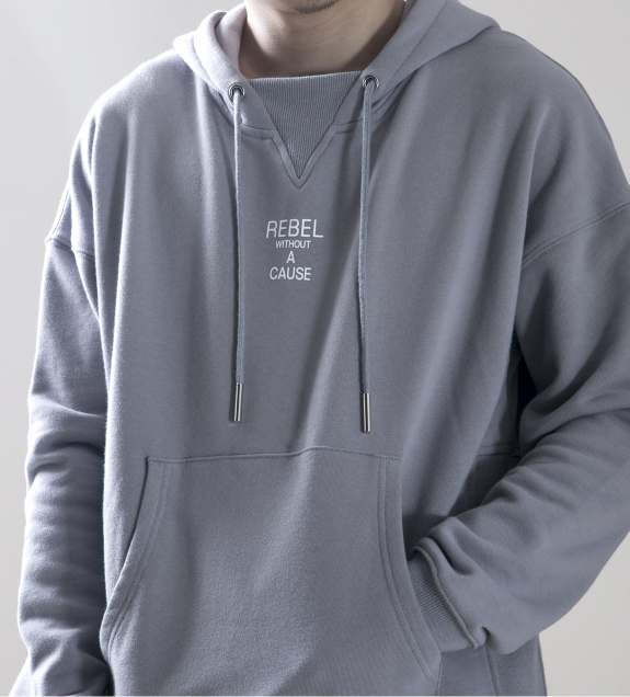 此款产品采用360G 32支 全棉厚卫衣毛圈面料, 全棉毛圈面料秋冬穿着舒适无静电, 舒适保暖,手感饱满,质感较好。 颜色选取靛蓝灰,一个非常适合秋冬的百搭冷色,上身效果极佳。