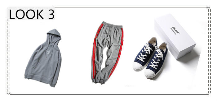 侧面的条纹间增加了立体股条设计,鲜明的对比色,利落的直线条,裤脚做了收口处理,很好地修饰了腿型。