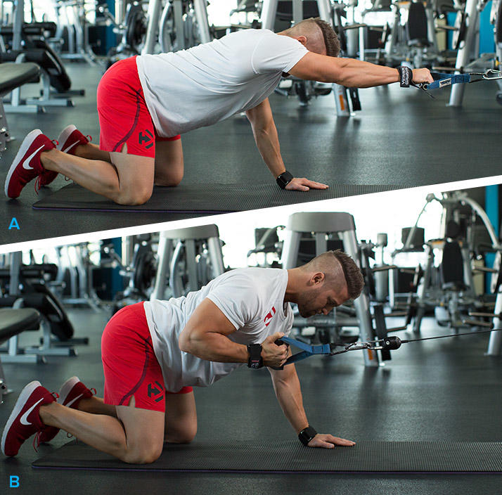 4.第四个动作,跪姿单臂下拉(反手)4x12一边,组间休息90秒。
