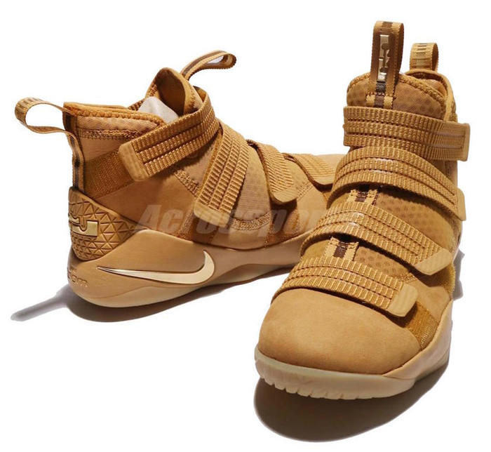 如今,这样的风潮在詹姆斯的鞋款中也还在继续,于是秉承着大黄靴的休闲风格同实战鞋款的融合,打造出了眼前的这双Nike LeBron Soldier 11 “Wheat”。除了小麦鞋身,生胶大底以外,颇有金属质感的logo也让鞋款显得更为精致。休闲实战两不误,这样的鞋款值得拥有。