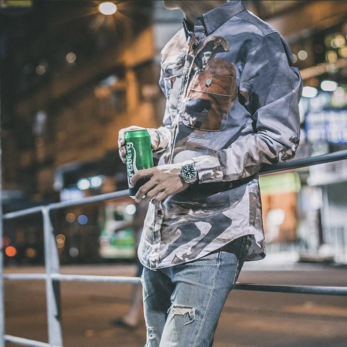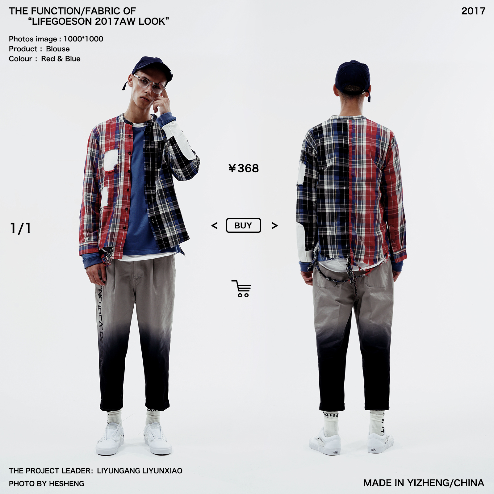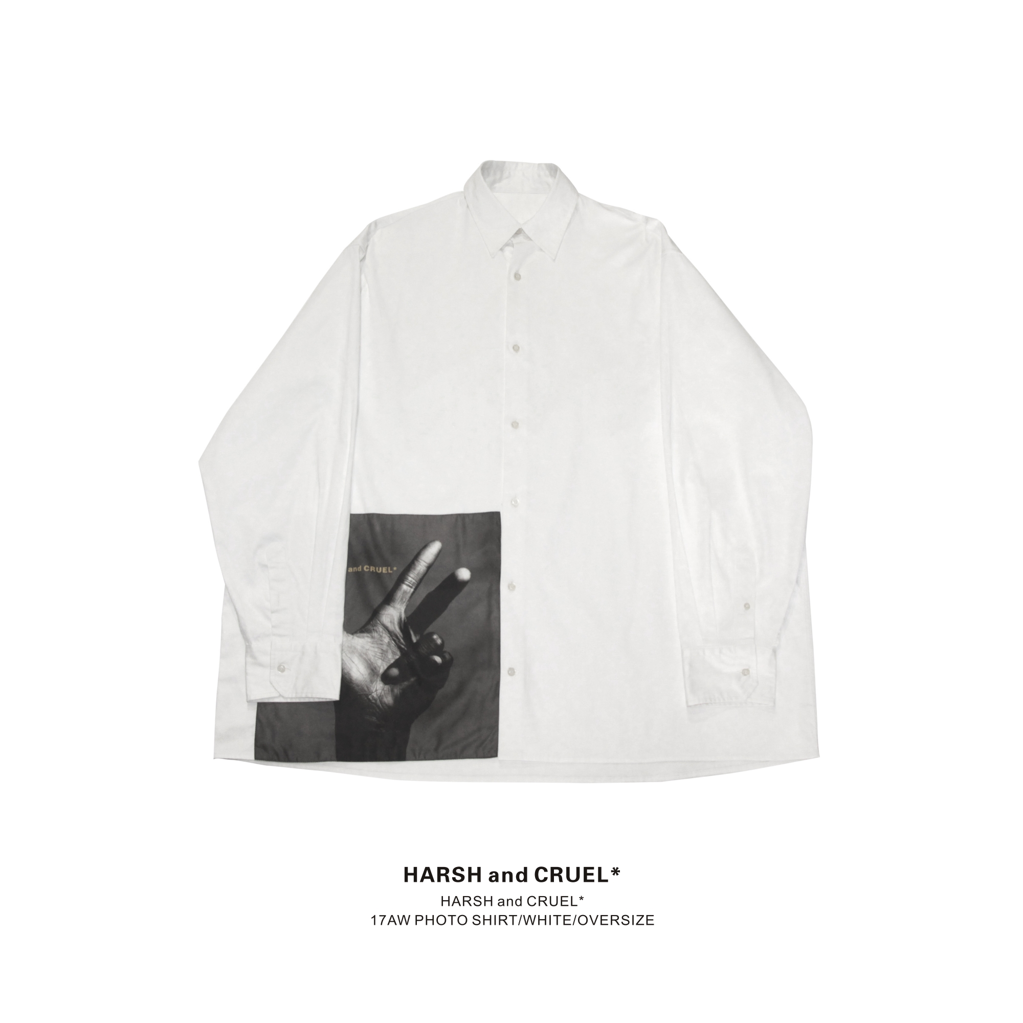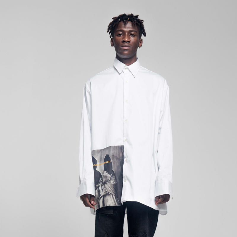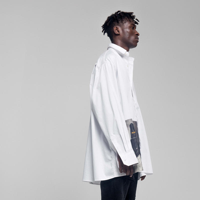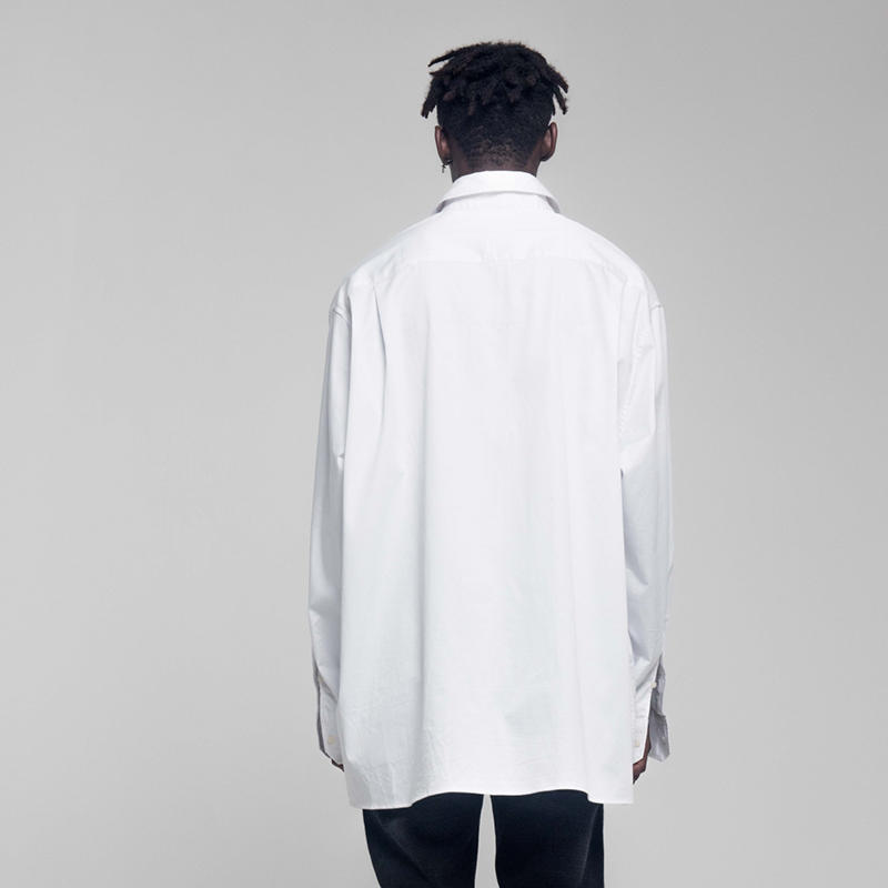 选用克重达 300g 的精梳丝光棉制作,面料手感柔和质感厚实,较普通棉耐磨,外观细腻。下摆处采用摄影印花拼接设计,来源于上世纪超现实摄影大师的作品,也是一种致敬的表达方式。Oversize 的廓形设定区别于循规蹈矩的衬衫版型,用新的美感进行衬衫的穿搭设计。