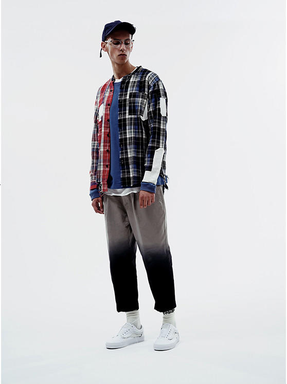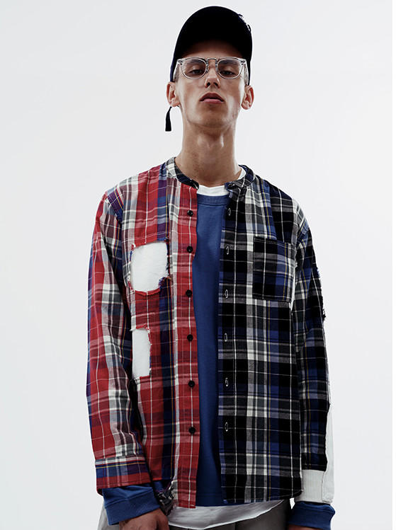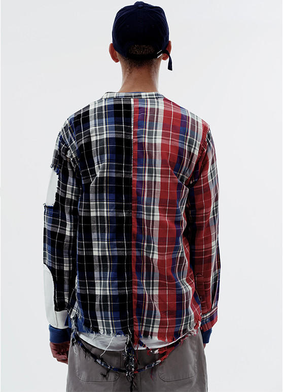 采用不同的格子面料来打造出强烈的对立感,袖口等多处位置使用白色卫衣布进行拼接,领口采用圆领设计,易于日常的搭配,下摆经过手工做旧处理,极具年代感,并增加整体层次感。