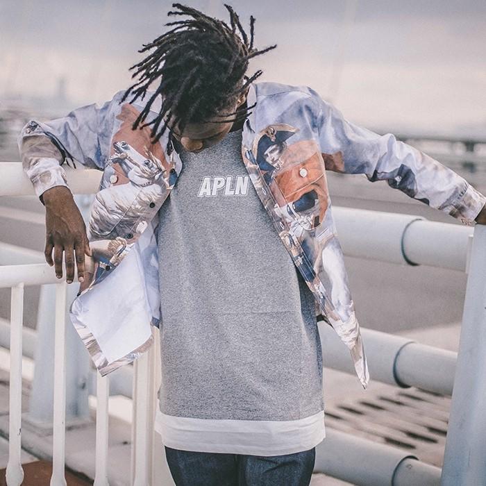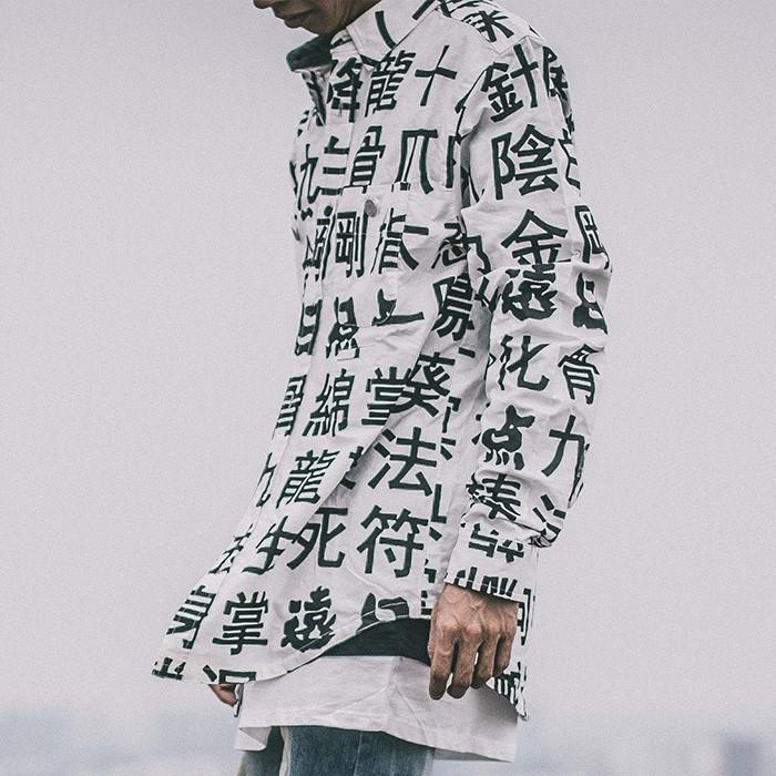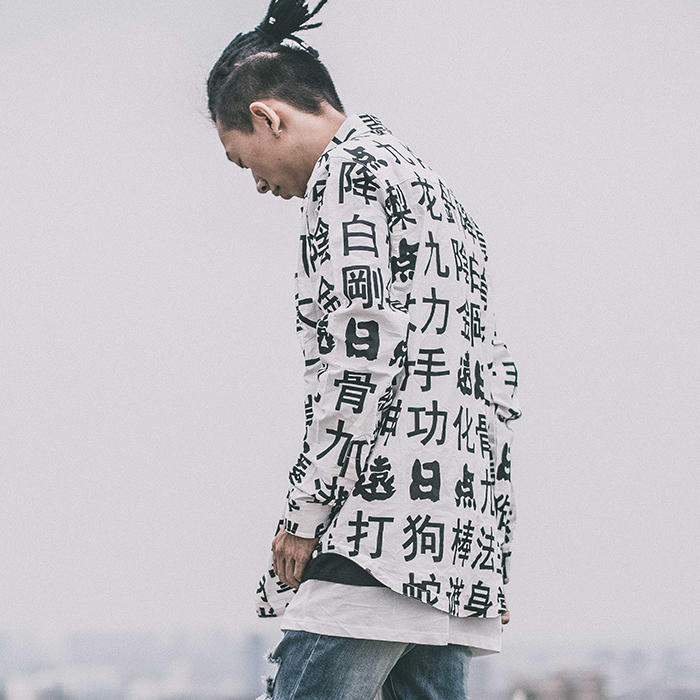 远日点汲取武侠招式灵感,以最简单直白的黑白文字形式设计。运用中国方块字本身的结构,呈现独特的波点形式。结合现今流行的衬衫样式,带来浓郁的中国风气息。同样以金属扣点缀,下摆包边处理等诚意十足的细节设定。