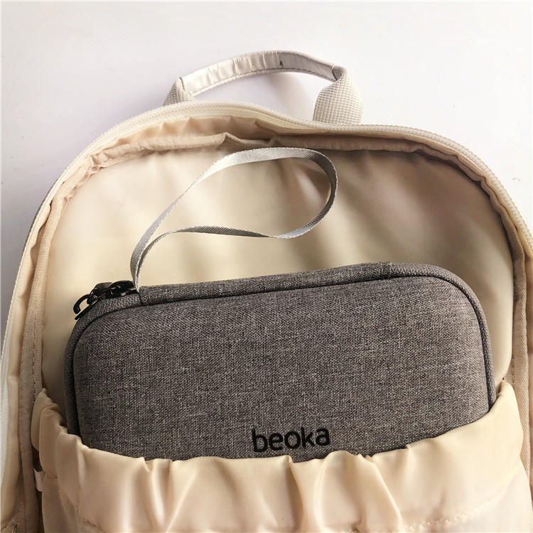 打开便携包拉链可以看到,包内一边可以放筋膜枪机身和五个不同功用的按摩头,另外一边的小网兜里就可以放充电线,并且这个便携包也是防水的,方便携带,也不容易丢失配件,带在身边随时给自己的肌肉来一场舒适按摩。