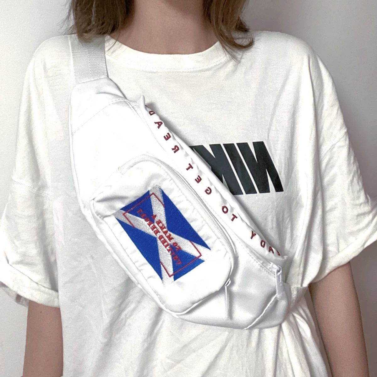 DRACONITE家的刺绣胸包 光滑细腻的手感,干净的白色 随便搭配件 t 恤,出街回头率都可以很高 日常气垫 胶囊雨伞都可以轻轻松松装下 解放双手的同时还可以时尚感满满