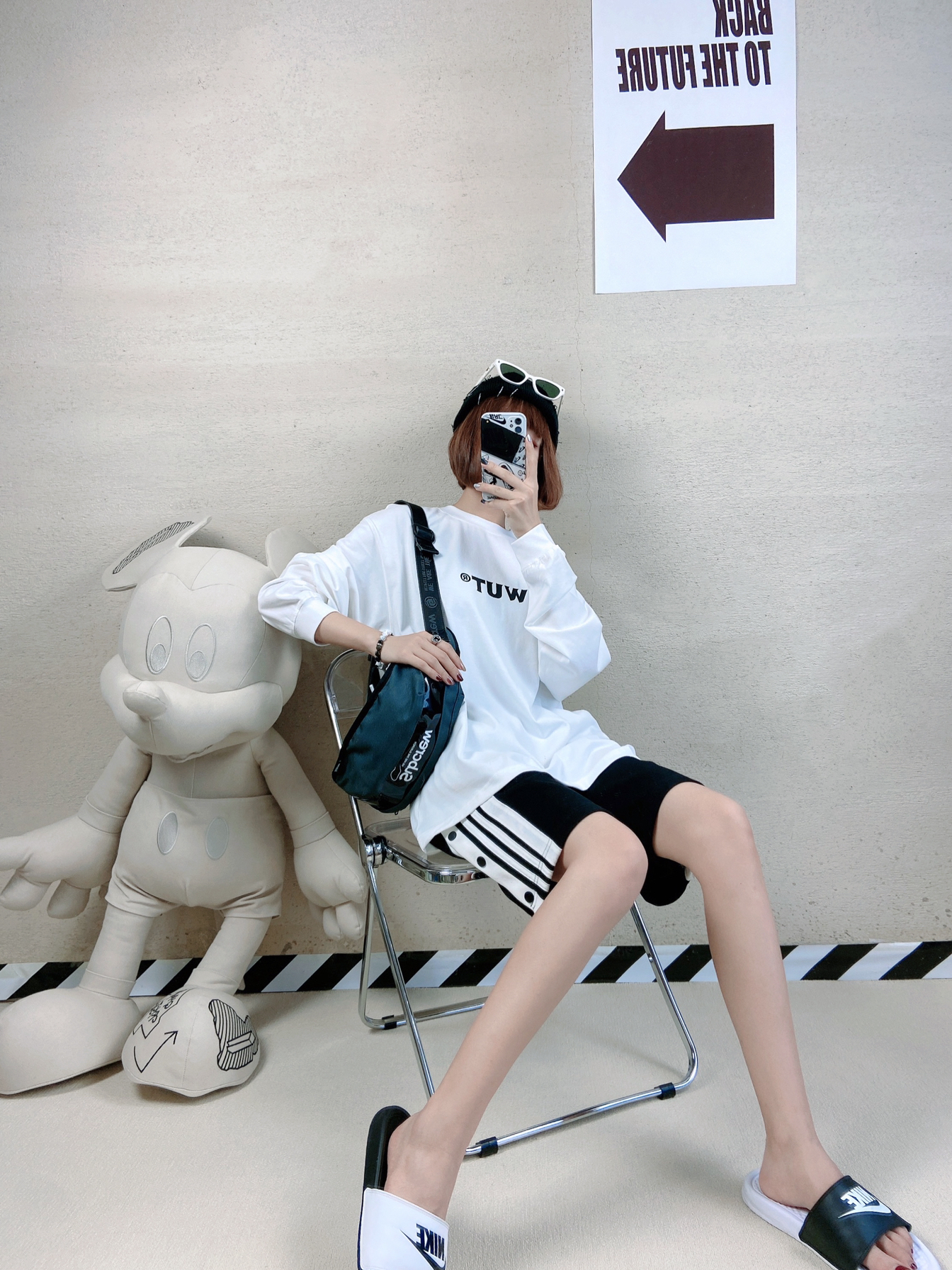 :178cm/73kg 又是一个下午才醒的一天,给大家分享一套穿搭吧。今天的这套穿搭偏日常百搭型。上身选择一件恐龙的黑色反光T恤搭配一条白色字母印花短裤。再来一双熊猫。包包和帽子再点缀一下。这样的一身就很休闲百搭好看啦。