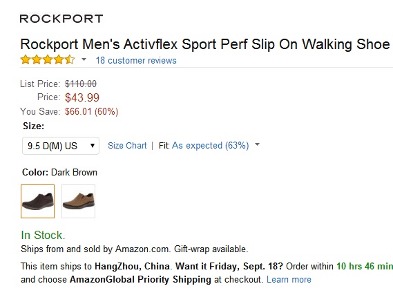 美国亚马逊$43.99(到手约¥390)限深棕色款9.5码特价,好码好价,值得下手!抓紧下单,以防价格突然回弹。同款淘宝代购价格537-998元之间不等,还是自己海淘低价保真!