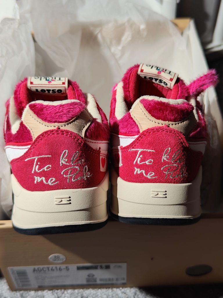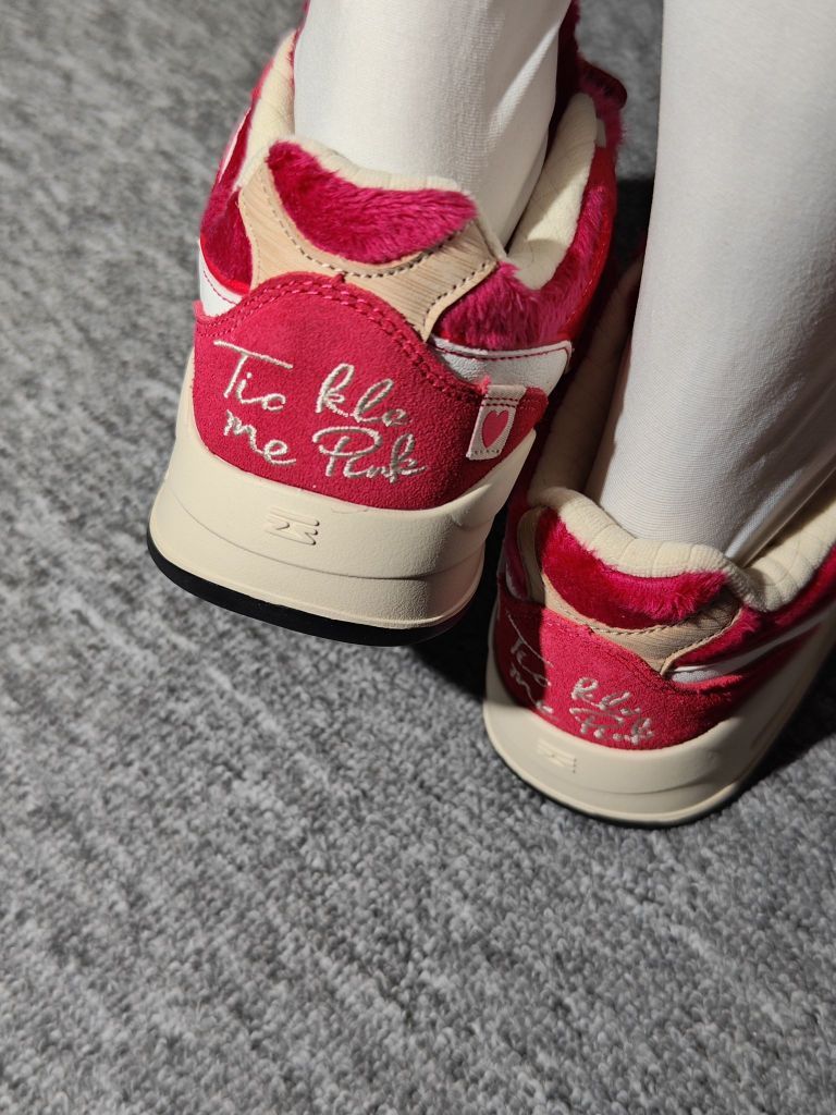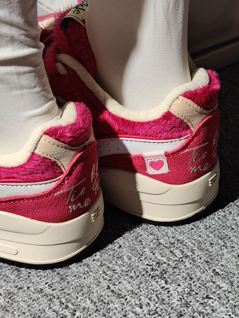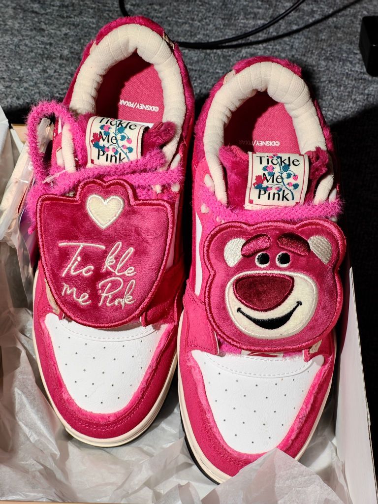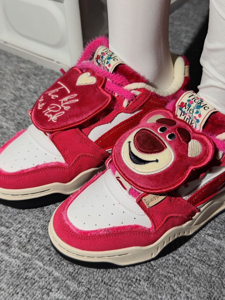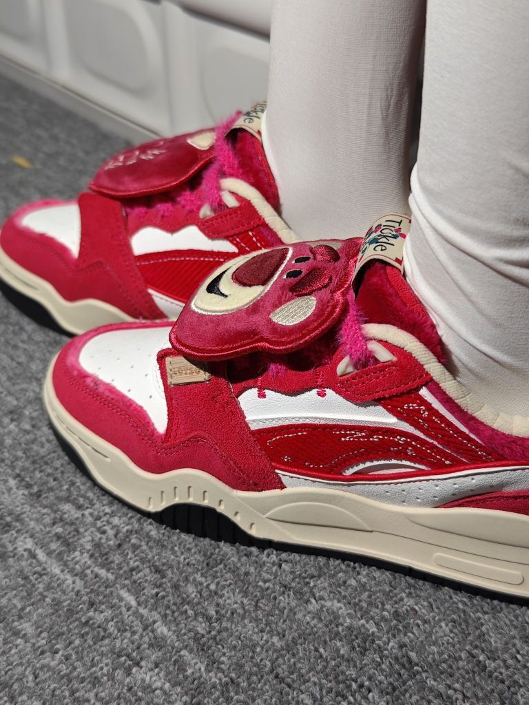 巨爱草莓熊!!!粉色的月白真的毛茸茸的,鞋底是李宁的云科技,比不上跑鞋软但是也比一般都板鞋要软一些。鞋带上送可拆卸的草莓熊形象盖片。鞋子采用的是毛绒、灯芯绒材料拼接成的后面还有刺绣,做工算是不错的了