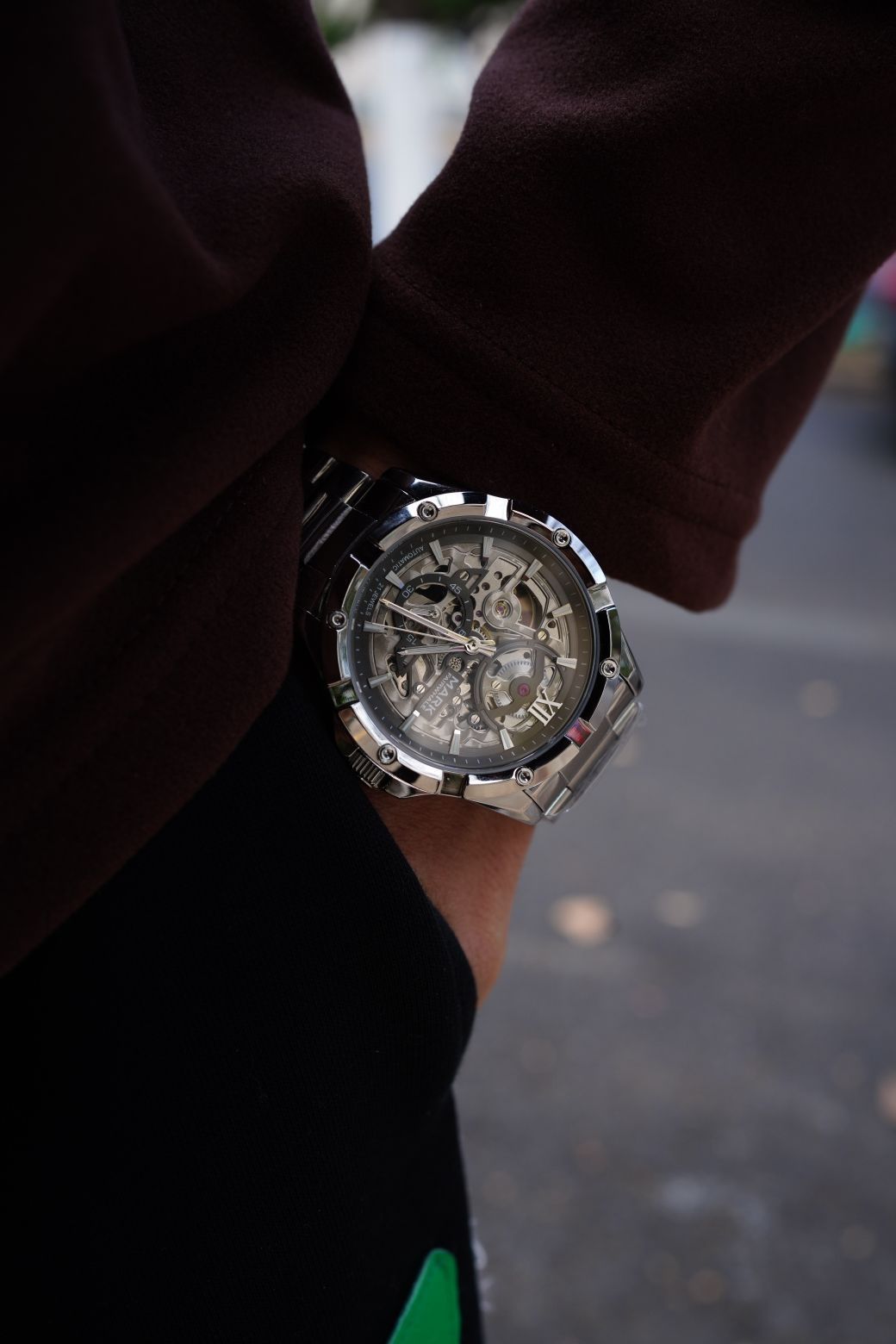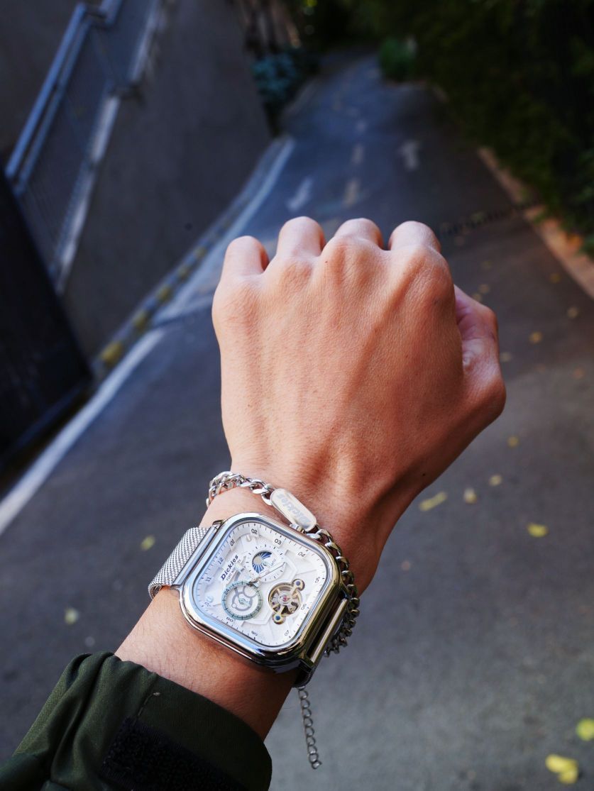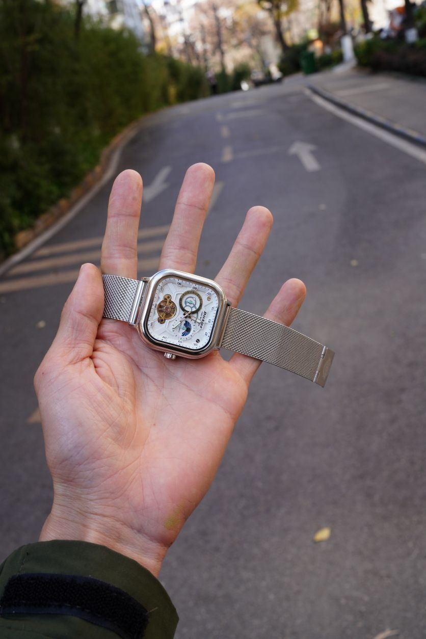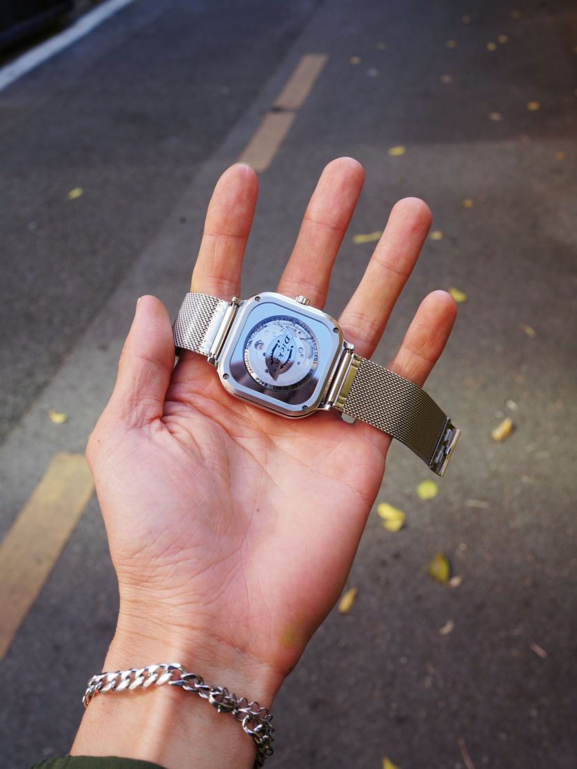 对于喜欢机械感的男生来说,很想要一块机械手表 后来我相中了这块帝克机械手表 首先是白色的方块深得我心,戴上就很复古素雅,里面有一个表盘像它的心脏,能看到它的跳动。还有月相盘,一股神秘机械的感觉 后面是透明的,能看到里面的齿轮 搭配它们的手链更加有感觉哟